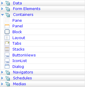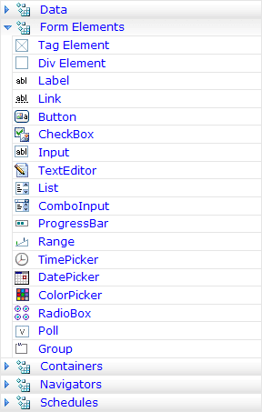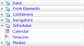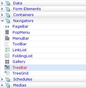 [Tool Box] contains a wide array of components that you can drop onto your web page. The components are divided into four groups, which are form elements, containers, navigators, schedules. To place a component on your web page, just click on the component's item in the component gallery and then drag it to your web page.
